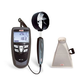 Das Flügelrad- Anemometer der Serie LV100 misst Luftgeschwindigkeit, Volumenstrom und Temperatur. Zur Auswahl stehen Flügelradsonden in drei verschiedenen Größen. Das kalibrierte Messgerät ist trotz seiner hohen Genauigkeit klein, leicht und kompakt. Das LV100 verfügt über viele Funktionen wie zB. Min/Max, HOLD, Volumenstromberechnung, Auto-OFF, uvm. Auf dem großen hintergrundbeleuchteten LC-Display lassen sich alle Messwerte deutlich ablesen.