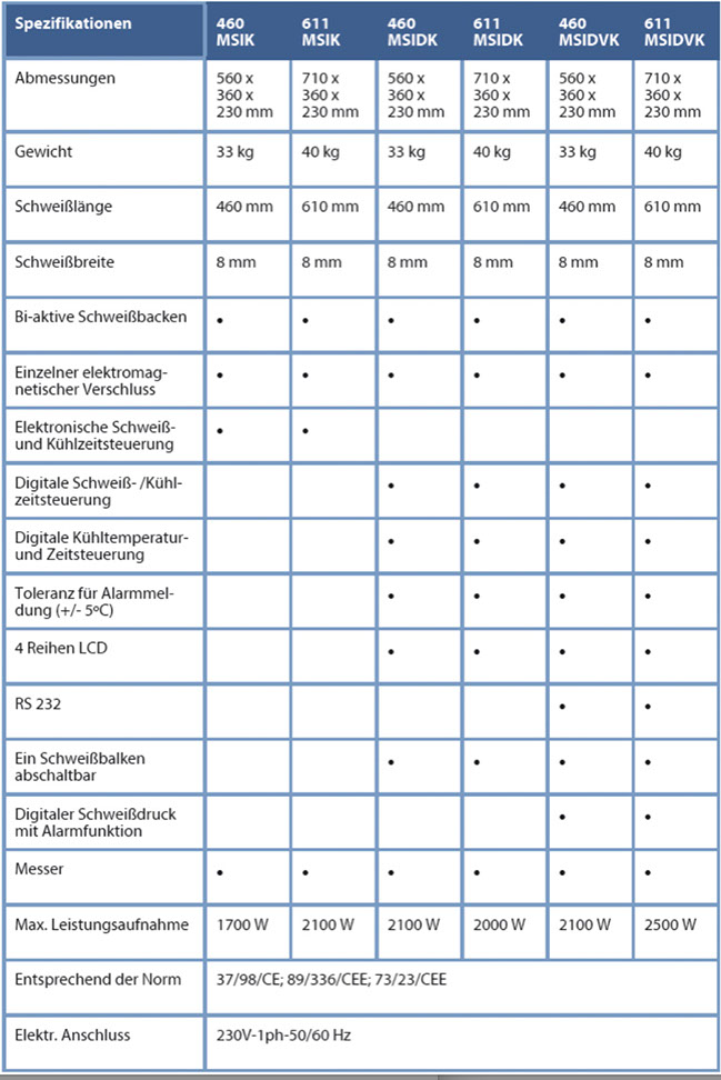 • Bi-aktive Schweißbalken geeignet für Verbundfolien und dickes Folienmaterial