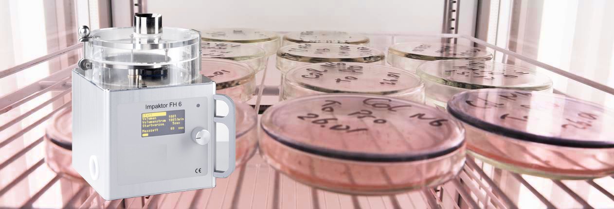 Bei der Impaktionsmethode werden die Keim beladenen Partikel aus dem angesaugten Luftstrom heraus direkt auf den Nährboden abgeschieden, auf dem die Aufzucht der koloniebildenden Einheiten erfolgt. Die Luft strömt an der Vorderseite des Gerätes durch eine Düse, in der die Geschwindigkeit des Luftstroms stark erhöht wird. Hinter der Düse wird der Luftstrom abgelenkt, die beschleunigten Partikel verlassen diesen auf Grund ihrer Massenträgheit und prallen auf den Nährboden. Benötigt werden 90 mm Standard Petrischalen. Diese werden in einer Klemmvorrichtung so gehalten, dass sie in jeder Geräteposition messen können. Für den einwandfreien Ablauf der Messung muss die Nährbodenhöhe kontrolliert werden. Stellen Sie die Petrischale auf eine ebene Fläche und messen Sie mit einem Lineal bis zur Oberkante des Nährbodens. Die Nährbodenhöhe sollte 4 – 6 mm sein.
