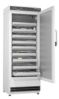 Dieser Medikamenten-Kühlschrank ist serienmäßig mit neun höhenverstellbaren Schubfächern aus Kunststoff ausgestattet. Die Schubfächer lagern auf Rollschubführungen mit Arretierung. Jedes Schubfach enthält zwei verstellbare Längs- und neun verstellbare Querteiler.