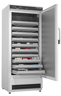 Dieser Medikamenten-Kühlschrank ist serienmäßig mit zehn höhenverstellbaren Schubfächern aus Kunststoff ausgestattet. Die Schubfächer lagern auf Rollschubführungen mit Arretierung. Jedes Schubfach enthält zwei verstellbare Längs- und zwölf verstellbare Querteiler.