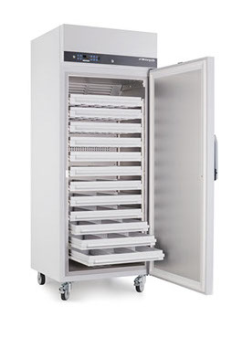 Dieser Medikamenten-Kühlschrank ist serienmäßig mit zwölf höhenverstellbaren Schubfächern aus Kunststoff ausgestattet. Die Schubfächer lagern auf Rollschub- führungen mit Arretierung. Jedes Schubfach enthält zwei verstellbare Längs- und zwölf verstellbare Querteiler.