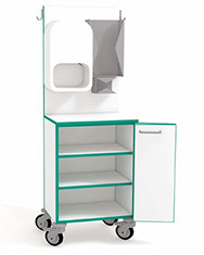 Mobiler IsoZimmerwagen mit dem berührungslosen Händedesinfektionsgerät Steripower-white edition Mit integrierten Vorratsregalen für Einweghandschuhe, Kopfhauben, Mundschutz, Kittel... - mit Kleiderkaken an den Seiten.