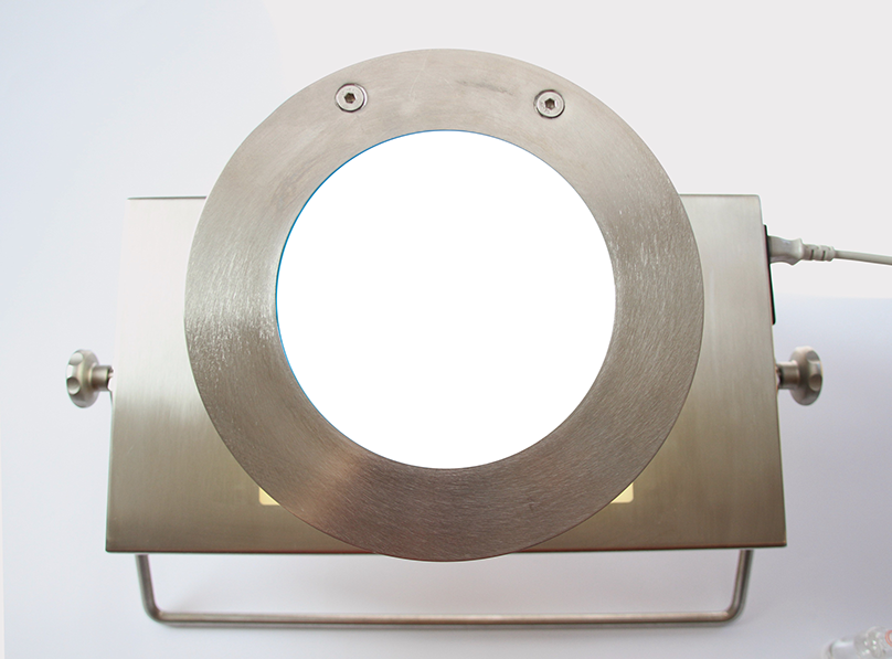 Die hinter dem Filter angeordnete Lichtquelle besteht aus 4 Leuchtstoffröhren mit je 8 Watt. Sie geben kaltes, weißes Licht ab. Das zweite Polarisationsfilter wird mit einem Abstandhalter vor dem Gerät befestigt.