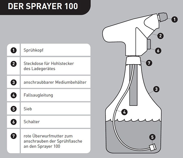 • Die Akkus können nicht überladen werden. Wir empfehlen deshalb, das Ladegerät ständig am Stromnetz angeschlossen zu lassen und den Sprayer100 nach Gebrauch wieder an das Ladegerät anzuschließen. Der Stromverbrauch ist dabei außerordentlich gering.